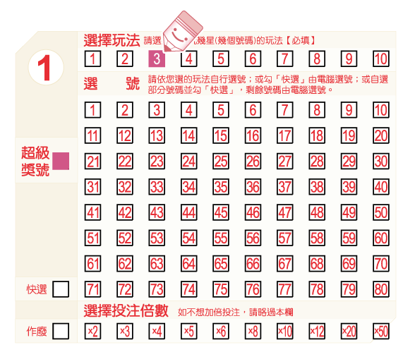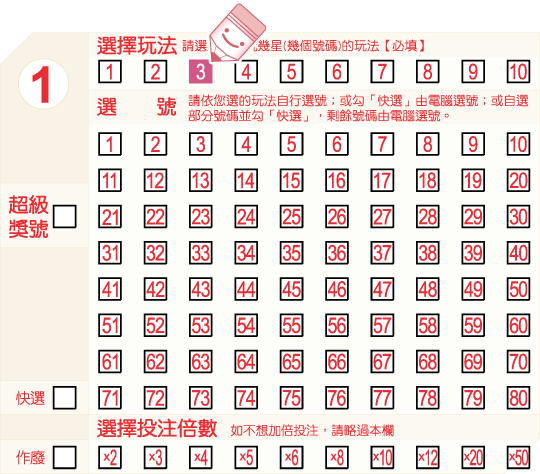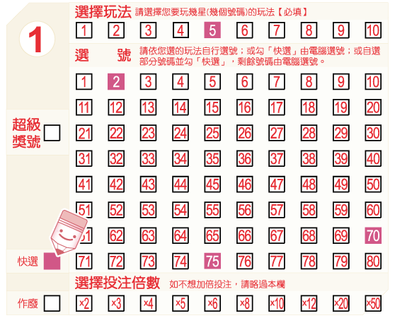 在選號區中,從01~80的號碼中自行填選少於玩法數的號碼,並劃記「快選」,投注機將自動為您選出剩下的號碼。